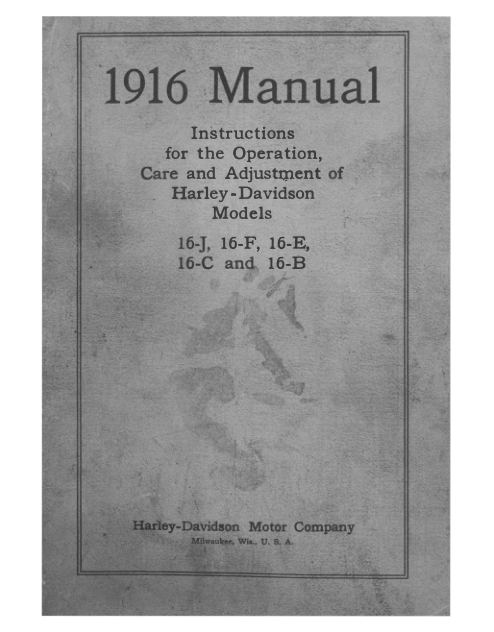 1916 H RS202 D Instructions for the Setting Up, Operation, Care, and Maintenance of Harley Davidson Motorcycles Models 16 J, 16 F, 16 E, 16 C, and 16 B A1b [202] pdf Manual
