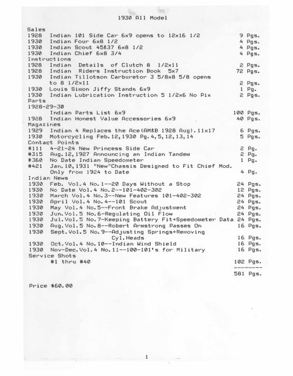 **1930 Indian RS449 All Model Indians Modern List of Documents and Page Count A1b [449] Manual**