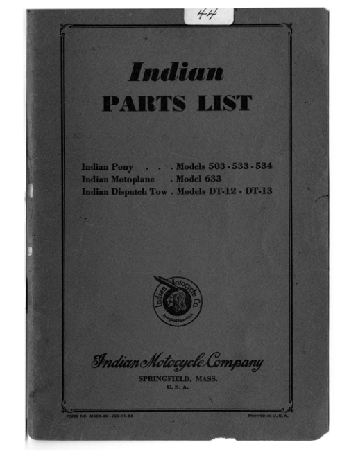 Model: RS481 Indian Parts List Pony 503,533,534 Motoplane 633 Dispatch Tow DT 12,DT 13 A1b [481]