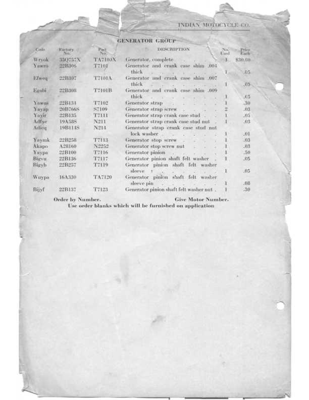 **Indian RS881 UNK Generator Group Order Sheet [881] Manual**
